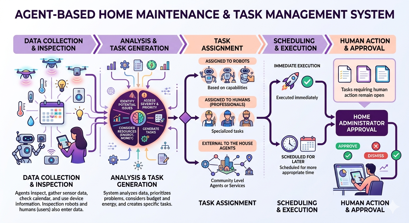 Agents inspect the home, collect data from sensors and devices, and take calendar events into account. Robots with inspection capabilities may collect data as well. Humans (users) may also enter data. Agents identify potential issues, assess severity and priority, and generate tasks. Resources like energy capacity and money are also taken into account. Tasks are assigned to robots based on their capabilities. They can also be assigned to humans (professionals) or other external to the house agents, like community level agents. Each task is either executed immediately or scheduled for a more appropriate time. Tasks that require human action remain open until a home administrator approves or dismisses them.